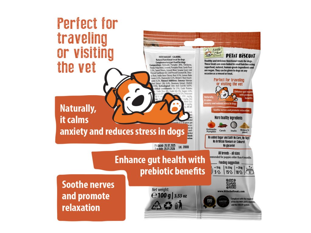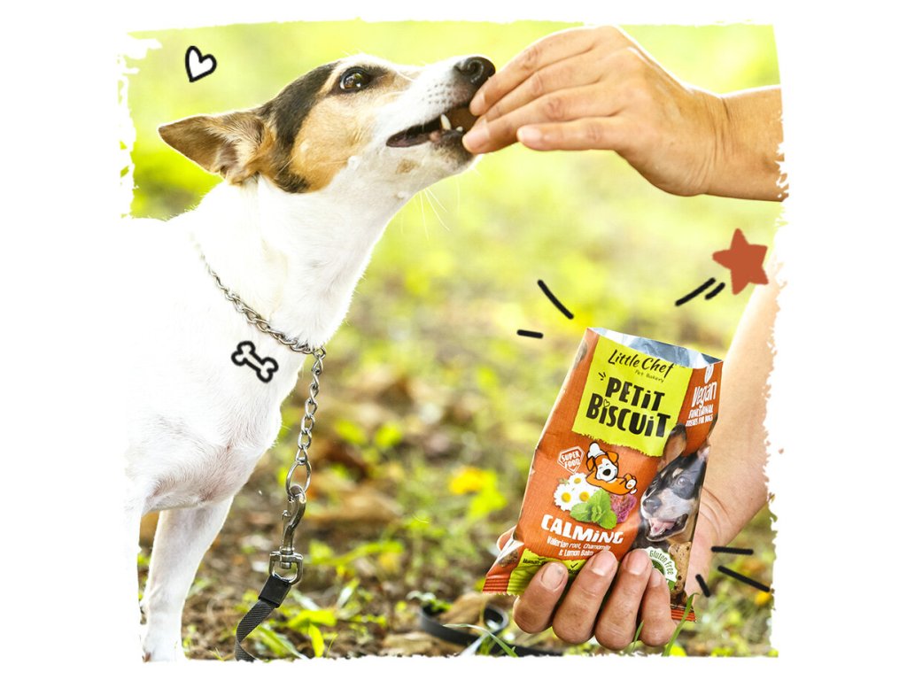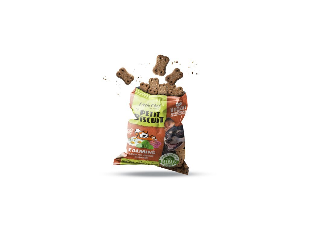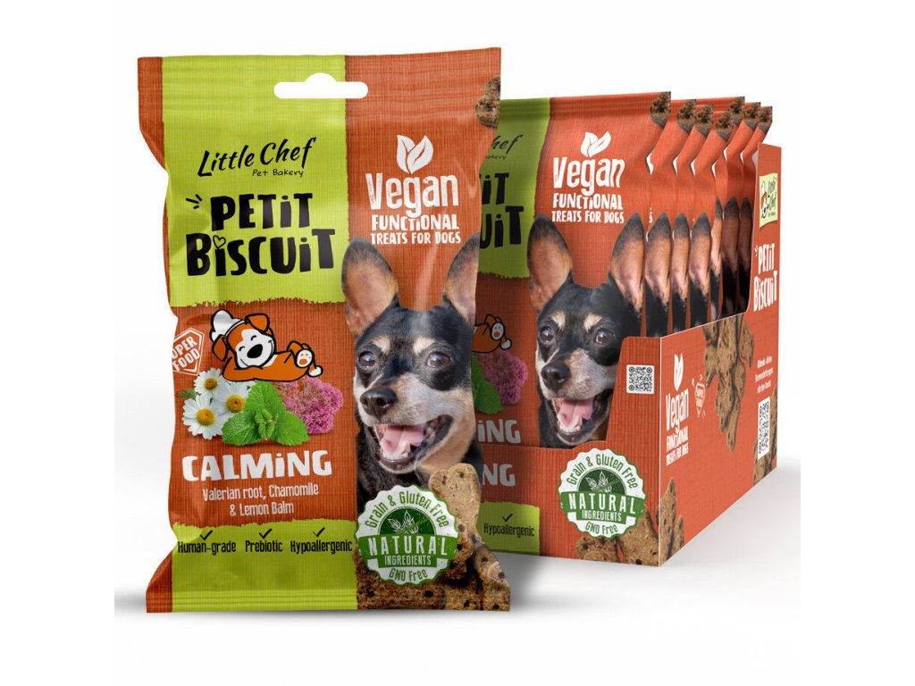 Petit Biscuit jsou funkční pamlsky pečené v malých dávkách z čistě veganských surovin v potravinářské kvalitě. Varianta Calming s kozlíkem lékařským, heřmánkem a meduňkou podporuje nervový systém a přispívá k celkové pohodě a klidu. Jsou skvělou volbou i pro psy, kteří procházejí stresovými situacemi, například při cestování, návštěvě veterináře nebo změně prostředí.