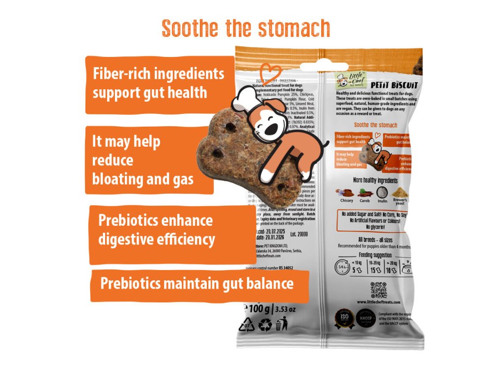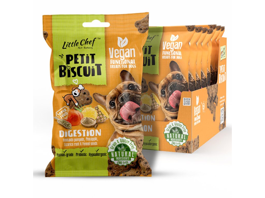 Petit Biscuit jsou funkční pamlsky pečené v malých dávkách z veganských surovin v potravinářské kvalitě. Tato receptura s dýní hokaido, ananasovou dření, lékořicí a semeny fenyklu byla navržena tak, aby přirozeně podpořila zdravé trávení, ulevila od nadýmání a podpořila rovnováhu střevní mikroflóry. Poslouží jako každodenní odměna a jako podpora zažívání pro všechny pejsky od 4 měsíců věku, a jsou velmi vhodné pro psy s citlivým zažíváním.