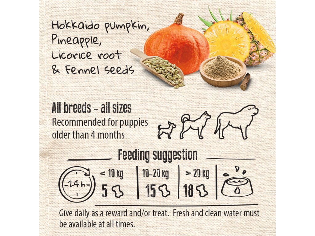 Ve složení najdete pouze přírodní veganské ingredience – žádné obiloviny, maso ani umělé přísady: Dýně hokaido je bohatá na vlákninu a šetrná k trávicímu traktu. Cizrna, bramborová a dýňová mouka dodávají energii, bílkoviny a další vlákninu. Lněné semínko a výlisky podporují zdravé trávení a jsou přirozeným zdrojem omega-3 mastných kyselin. Karobová mouka přispívá k normální funkci střev a dodává pamlskům nasládlou chuť. Lékořicový kořen má zklidňující účinky na trávicí soustavu, semena fenyklu pomáhají proti nadýmání a ananasová dřeň obsahuje enzymy, které napomáhají trávení bílkovin. Inulin a pivovarské kvasnice působí jako prebiotika – podporují růst prospěšných bakterií ve střevech a tím i celkovou rovnováhu zažívacího systému. Pamlsky jsou dochucené rozmarýnovým extraktem, který funguje jako přírodní antioxidant.