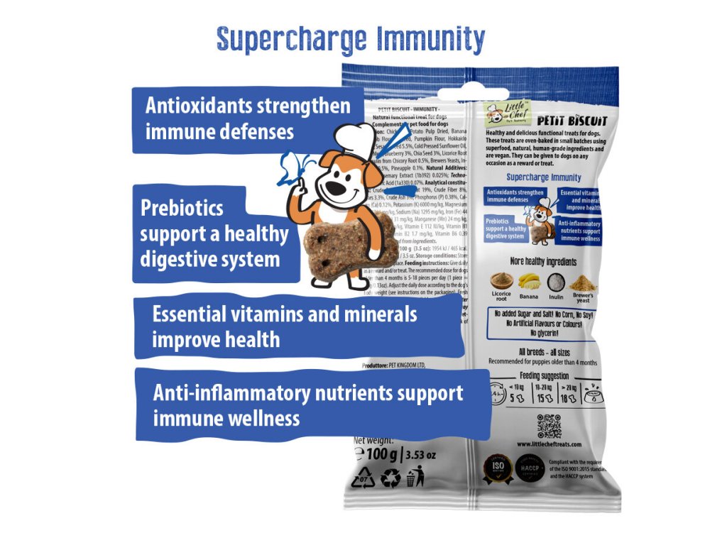 Petit Biscuit Immunity jsou funkční pamlsky pečené v malých dávkách z veganských surovin v potravinářské kvalitě. Jejich receptura s borůvkovou a ananasovou dření, chia semínky a sezamem byla navržena tak, aby přirozeně podpořila imunitní systém, celkovou vitalitu a odolnost organismu.