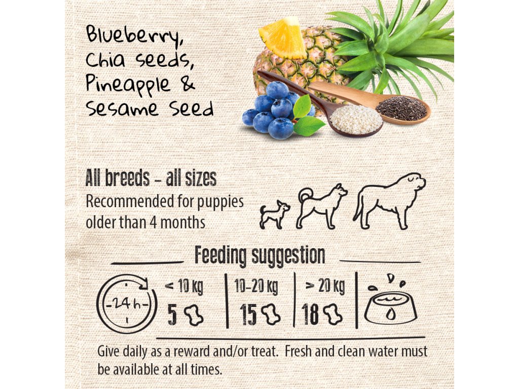 Pamlsky obsahují pouze přírodní veganské suroviny – žádné obiloviny, maso ani umělé přísady. Cizrna, bramborová mouka a banánová dřeň dodávají energii, vlákninu a důležité živiny. Borůvky jsou bohaté na antioxidanty, které posilují obranyschopnost a chrání buňky před oxidačním stresem. Chia a lněná semínka přispívají k imunitě i zdraví kůže a srsti díky obsahu omega-3 mastných kyselin. Sezamové semínko dodává důležité minerály jako je vápník, zinek a hořčík. Ananasová dřeň obsahuje enzymy, které napomáhají trávení a vstřebávání živin. Kořen lékořice má protizánětlivé účinky a pozitivně ovlivňuje imunitní i trávicí systém. Inulin a pivovarské kvasnice působí jako prebiotika – podporují růst prospěšných bakterií ve střevech a tím i celkovou rovnováhu v organismu. Pamlsky jsou dochucené rozmarýnovým extraktem, který působí jako přírodní antioxidant.