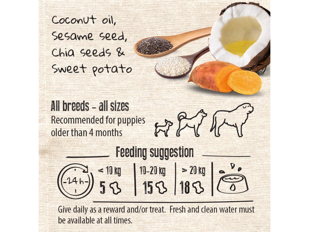 Pamlsky obsahují pouze přírodní veganské ingredience a nenajdete v nich žádné obiloviny ani umělé přísady. Batáty a cizrna dodávají energii, vlákninu a rostlinné bílkoviny. Bramborová a dýňová mouka jsou lehce stravitelné a přispívají ke zdravému trávení. Kokosový olej lisovaný za studena je bohatý na kyselinu laurovou a zdravé tuky, které pomáhají udržovat kůži hydratovanou a srst lesklou. Sezamová a chia semínka jsou přírodním zdrojem omega-3 a omega-6 mastných kyselin, které mají protizánětlivé účinky a podporují zdraví kůže i srsti. Lněné semínko a výlisky zlepšují vstřebávání živin, které jsou pro pokožku zásadní. Inulin a pivovarské kvasnice působí jako prebiotika – podporují zdravé trávení a tím i lepší využití živin z potravy. Pamlsky jsou dochucené přírodním rozmarýnovým extraktem, který zároveň působí jako antioxidant.
