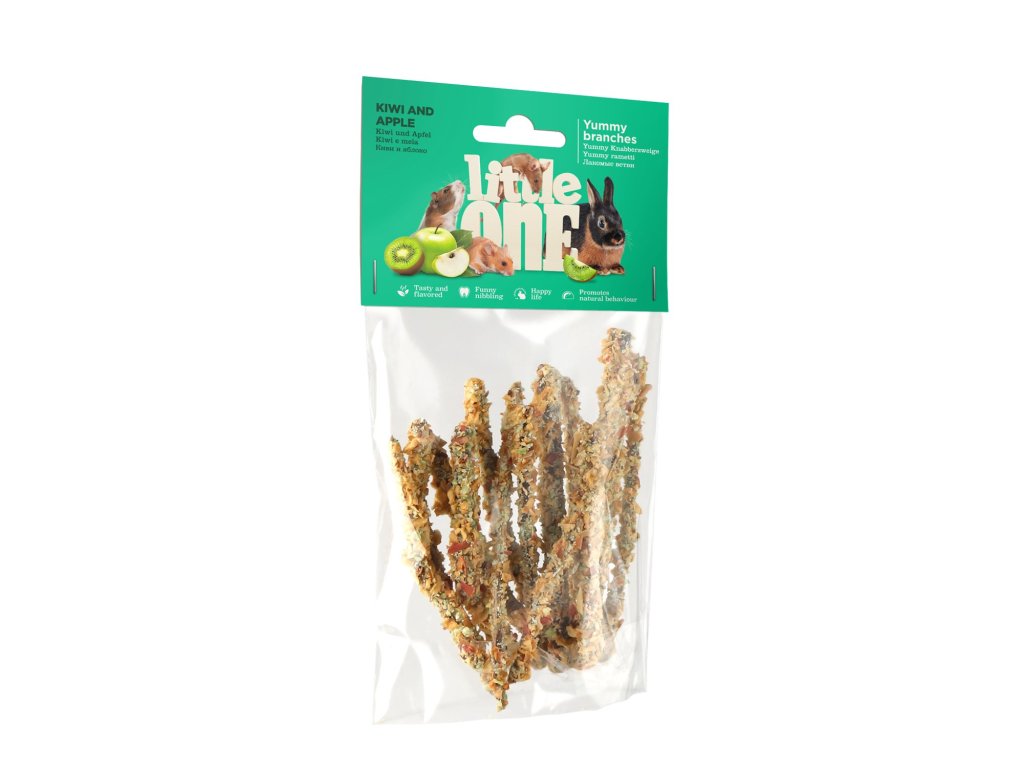 Báječný pamlsek pro králíky a hlodavce, na kterém si pochutnají, zabaví se a zároveň si přirozeným způsobem obrousí zuby. Větvičky jsou obalené jablky a kiwi, díky čemuž jsou opravdu lákavé, chutné a zdravé. Tento pamlsek je cenným zdrojem vitaminů a minerálních látek. Udržuje zvíře šťastné a přispívá k jeho přirozenému chování.