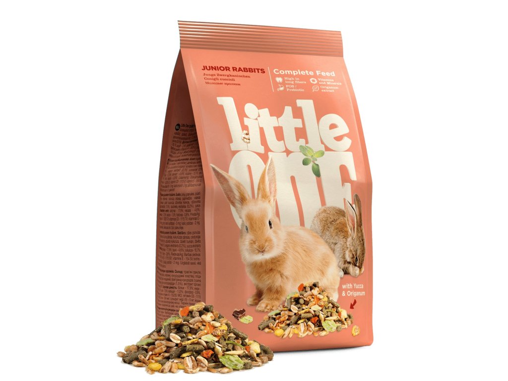 Little One kompletní krmivo pro mladé zakrslé králíky do šesti měsíců věku obsahuje správný poměr bílkovin, tuků, uhlohydrátů, minerálů a vitamínů v obilninách a zelenině a travních peletách. Jeden mladý králík spotřebuje asi 30 g/den. K tomu pravidelně přidejte ještě dostatek pitné vody a seno.
