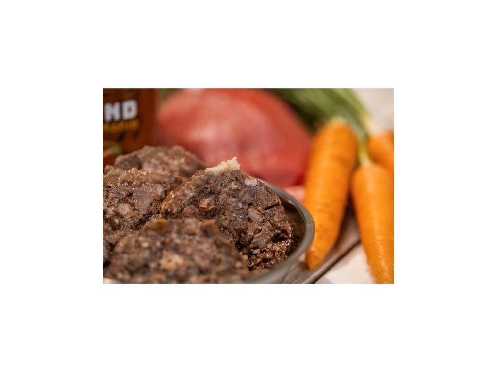 Šťavnaté kompletní krmivo v konzervě obsahuje 95 % mletého hovězího masa v pevné složce. Zbylých 5 % obsahu tvoří mrkev, přidané vitamíny a minerály a rozemletý prášek z hovězích kostí, který funguje jako přírodní zdroj vápníku a fosforu v přirozeném poměru. Rostlinná složka supluje obsah žaludku býložravé kořisti ve volné přírodě.