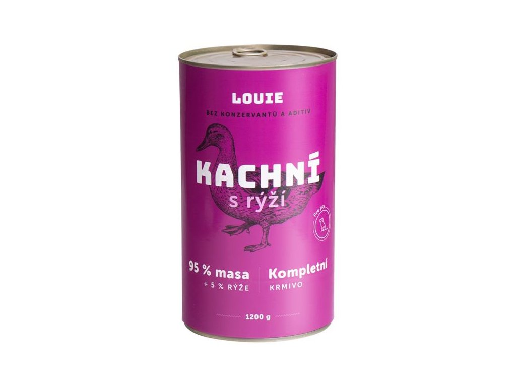 Masová konzerva pro psy Louie s obsahem 95% jemně namletého masa a s 5% rýže bez přidané želatiny, konzervantů, dochucovadel, barviv či stabilizátorů.