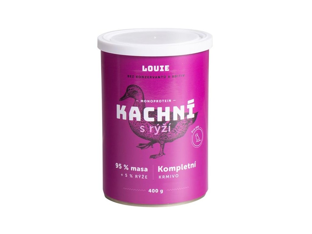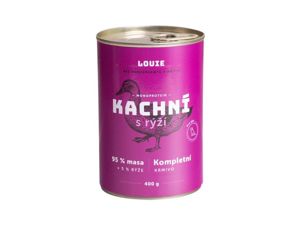 Masová konzerva pro psy Louie s obsahem 95% jemně namletého masa a s 5% rýže bez přidané želatiny, konzervantů, dochucovadel, barviv či stabilizátorů.