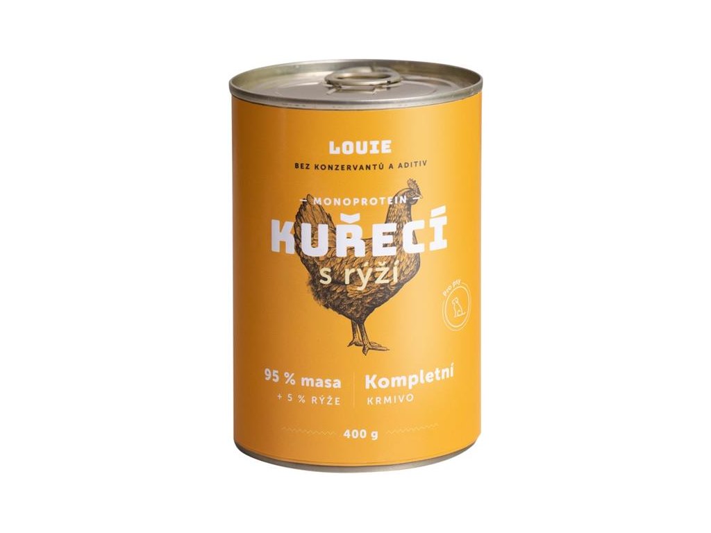 Masová konzerva pro psy Louie s obsahem 95% jemně namletého masa a s 5% rýže bez přidané želatiny, konzervantů, dochucovadel, barviv či stabilizátorů.