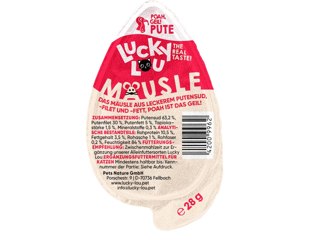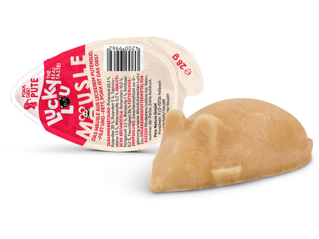 Lucky Lou Mäusle je šťavnatý pamlsek pro kočky, který krom nevšedního chuťového zážitku pobaví i svým vzhledem.