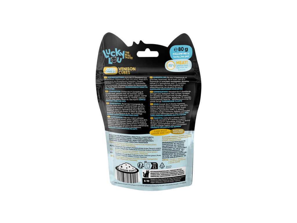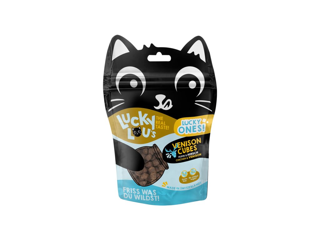 Lucky Ones Cubes jsou šťavnaté kostičky kuřecího a jeleního masa, které se perfektně hodí pro časté odměňování a hru s vaší kočkou.
