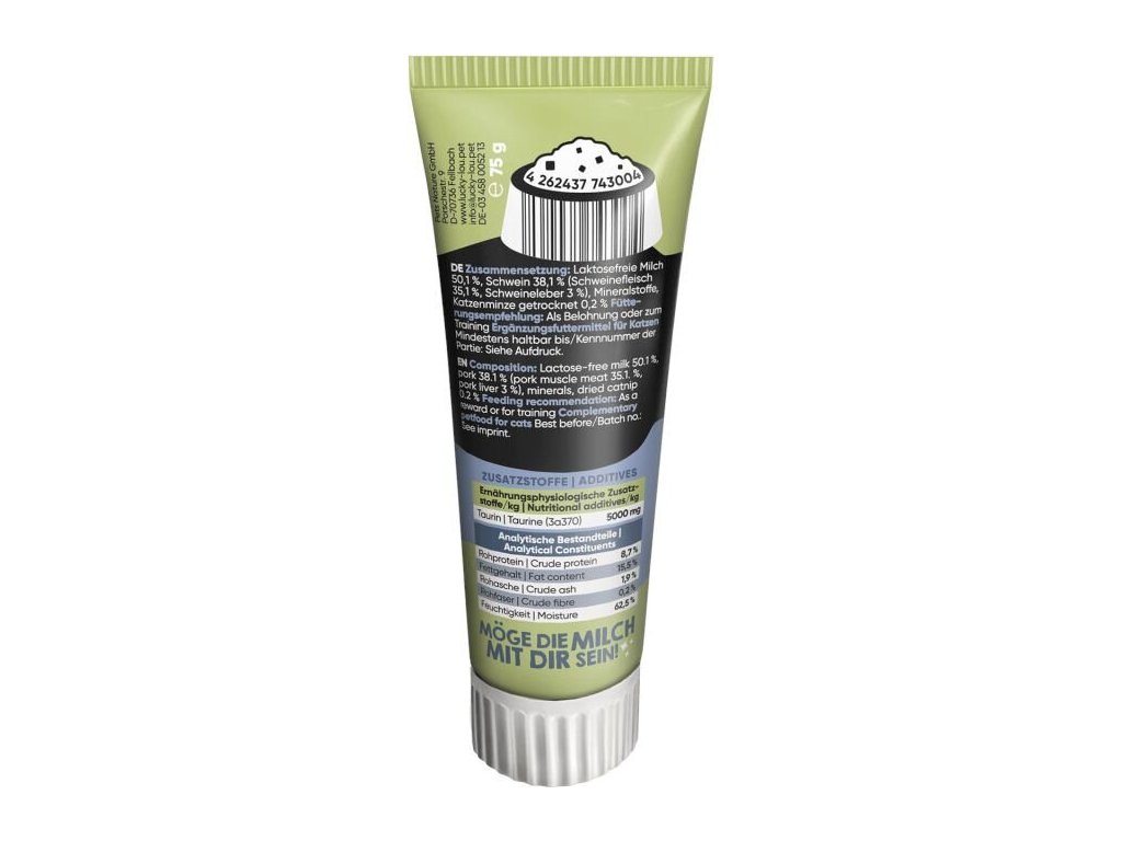 Složení: mléko 50,1 % (bez laktózy), vepřové maso 38,1 % (vepřové maso 35,1 %, vepřová játra 3 %), minerální látky, sušená šanta kočičí 0,2 %