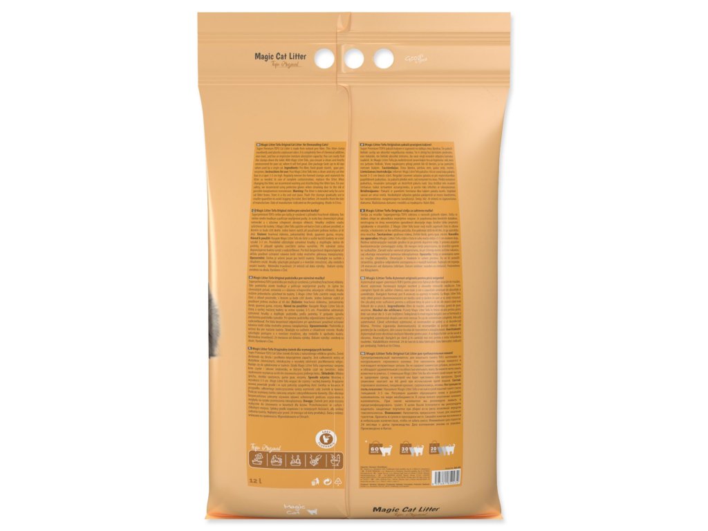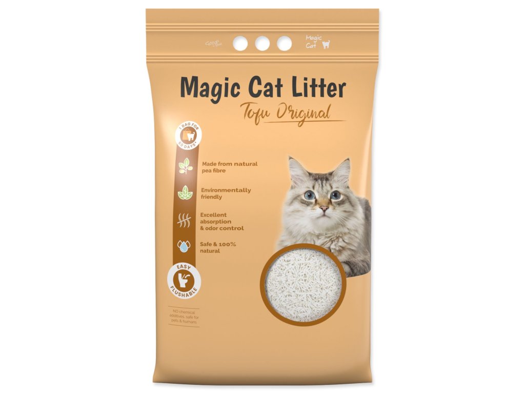 Je zcela bez chemických přísad, netoxické a s úžasnou schopností absorpce vlhkosti. Hrudky můžete snadno spláchnout do toalety. S Magic Litter Tofu zajistíte své kočce čisté a zdravé prostředí, ve kterém se bude cítit skvěle. Jedno balení vydrží při používání jednou kočkou až 30 dnů.