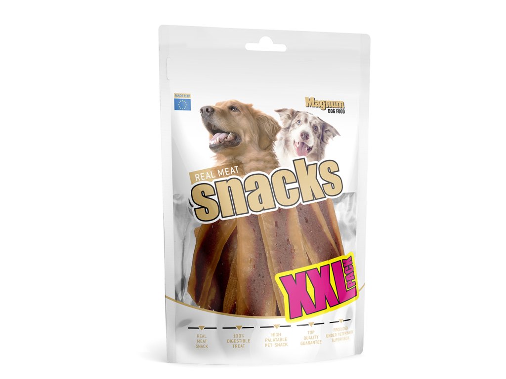 Na vršku balení je uzavíratelný zip, díky kterému se jeho obsah nevysouší a pamlsky jsou déle čerstvé a chutné. Určení: Dospělí psi všech plemen. Složení: kuřecí maso, hovězí maso, škrob, rostlinný protein, glycerin. Analytické složky: hrubý protein 42 %, obsah tuku 2 %, hrubý popel 4 %, hrubá vláknina 3 %, vlhkost 18 %. Krmný návod: