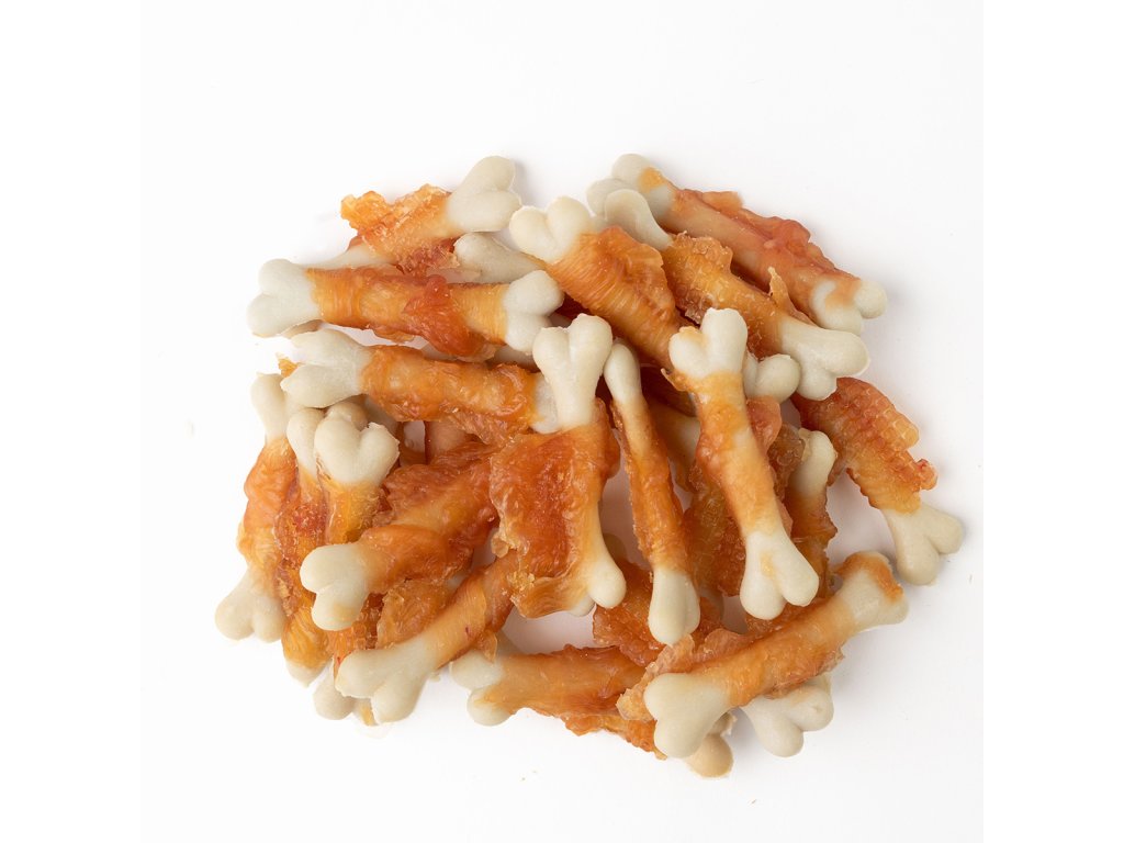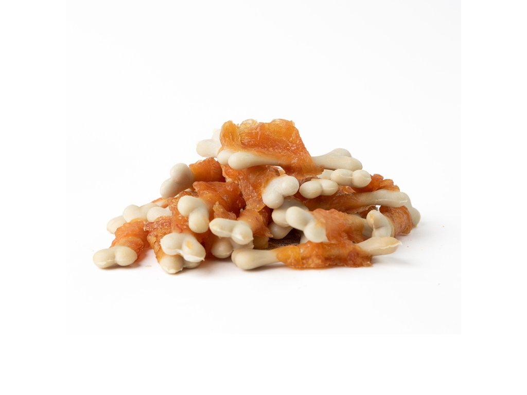 Kuřecí svalovina omotaná na křupavé kalciové kostičce.