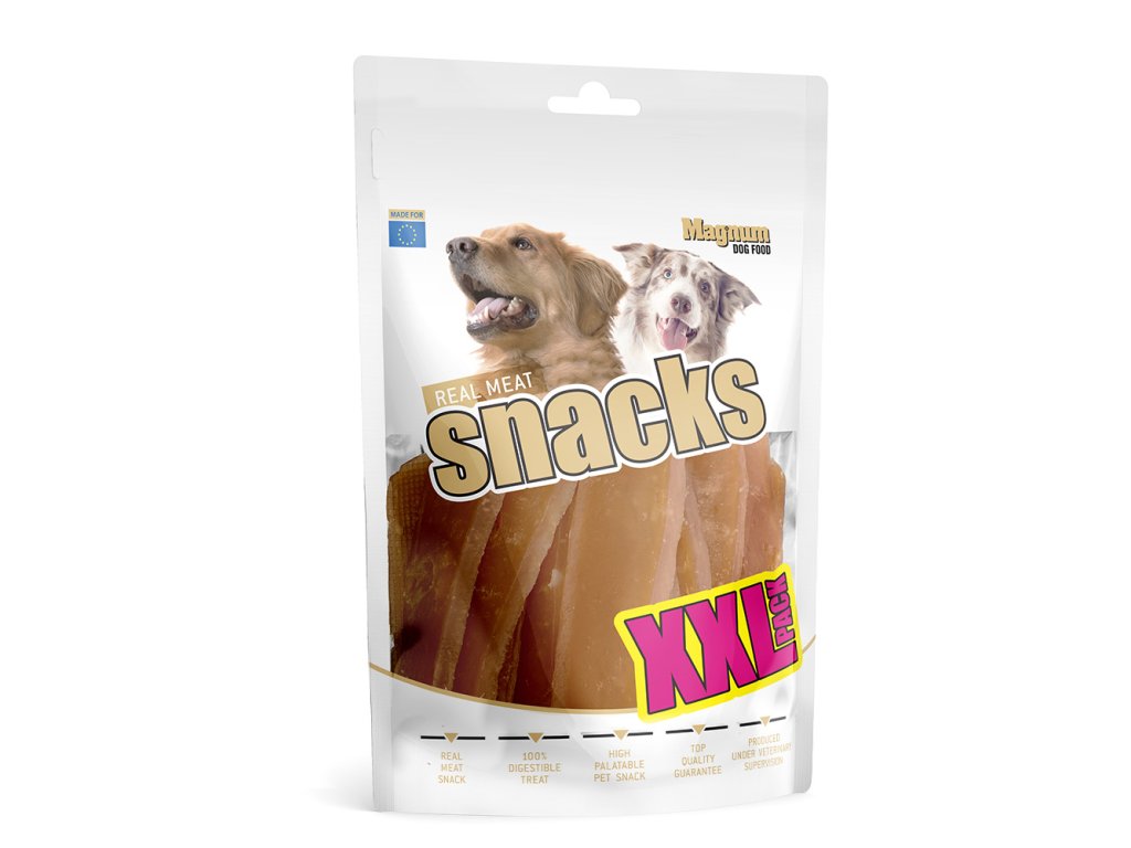 Na vršku balení je uzavíratelný zip, díky kterému se jeho obsah nevysouší a pamlsky jsou déle čerstvé a chutné. Určení: Dospělí psi všech plemen. Složení: kuřecí maso, škrob, rostlinný protein, glycerin. Analytické složky: hrubý protein 50 %, obsah tuku 2 %, hrubý popel 4 %, hrubá vláknina 3 %, vlhkost 18 %. Krmný návod: