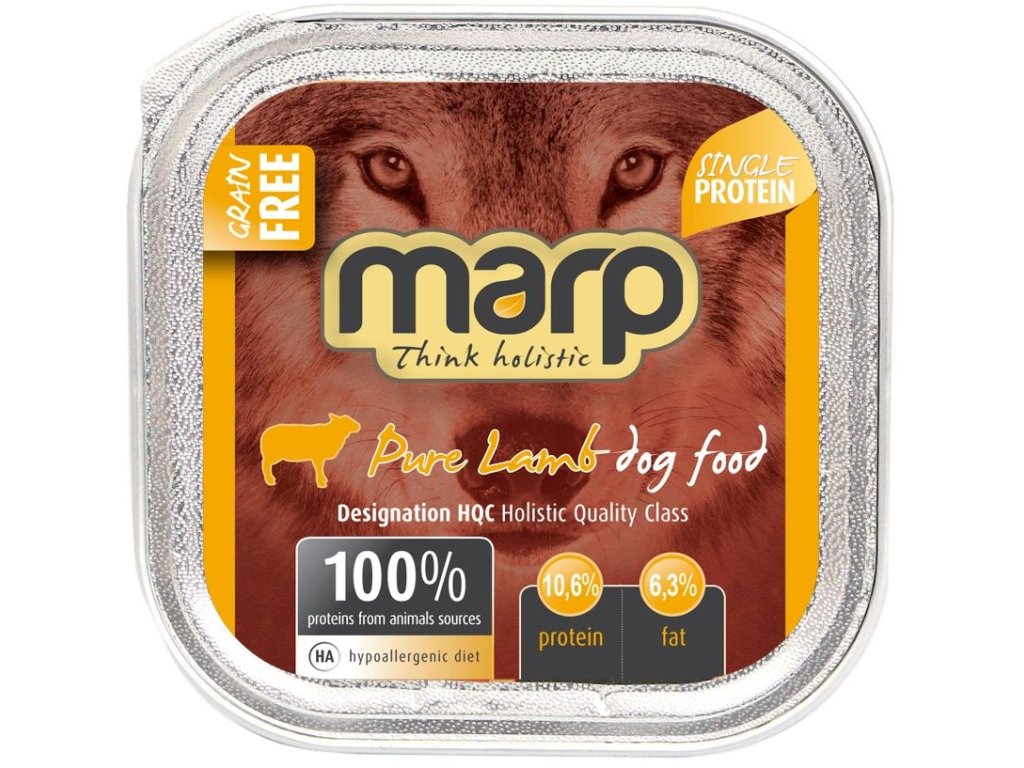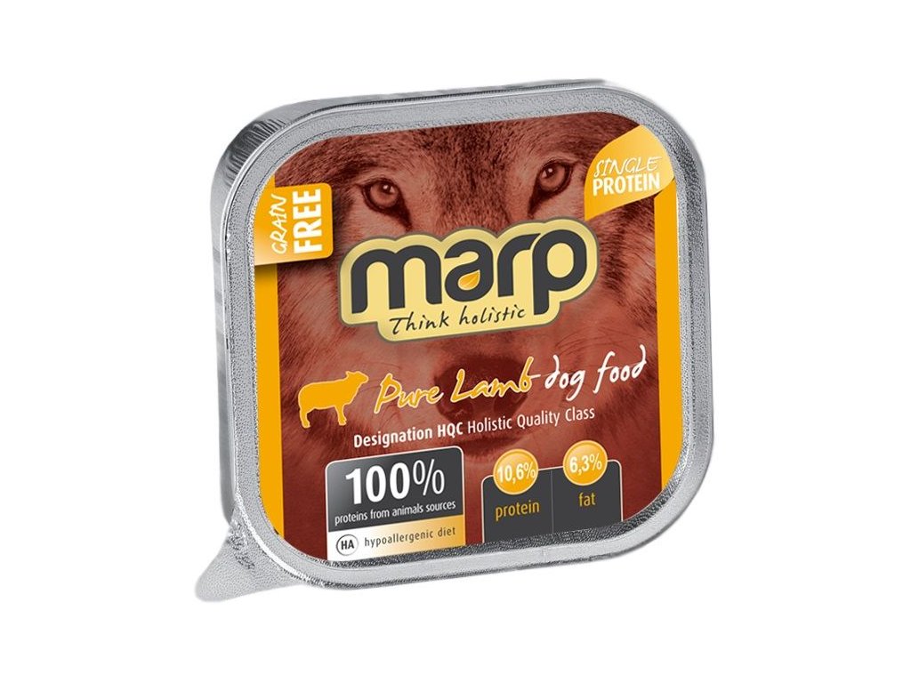 Holistická masová vanička Marp Pure Lamb je stvořená pro psí labužníky. Je zcela přírodní, bez obilovin a aditiv. Obsahuje 71% jehněčího a dále jen masový vývar a minerální látky. Díky svému složení je vanička vhodná pro psy každého věku včetně štěňat.