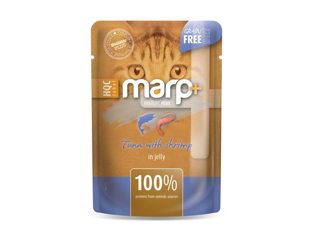 Tuňák s celými krevetami v želé – žádné vnitřnosti, žádné umělé doplňkové látky, žádné obiloviny – to jsou špičkové kapsičky Marp Holistic Plus pro kočky. Respektujeme kočku jako masožravce, a proto pochází 100 % bílkovin ze živočišných zdrojů. Toto krmivo bude vaše kočka skutečně zbožňovat.