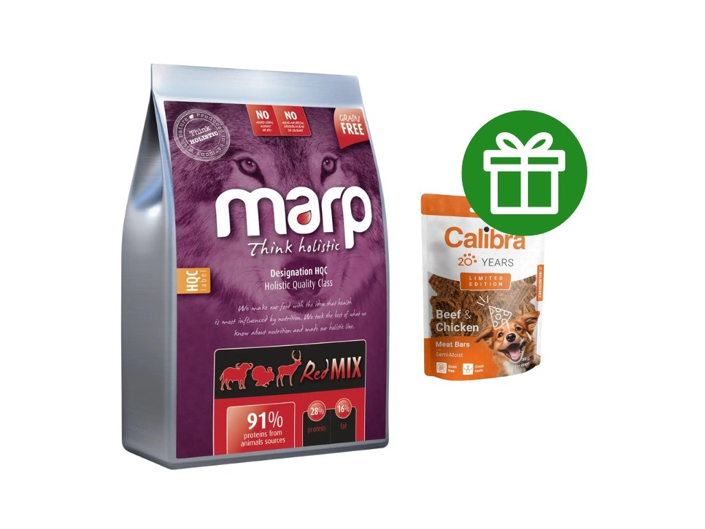 Krmivo Marp Red Mix s neobvyklými zdroji bílkovin jako je hovězí plemene Aberdeen Angus nebo zvěřina. Špičkové holistické krmivo s tmavým masem vhodné i pro alergické psy (hypoalergenní). Jedinečná bezobilná multiproteinová receptura s hovězím a krůtím masem, zvěřinou, sladkými brambory a spoustou bylinek. Receptura obsahuje prebiotika a komplex kloubní výživy - MSM, glukosamin a chondroitin. Marp je konzervován přírodními tokoferoly a rozmarýnem, neobsahuje umělé konzervanty, hormony ani barviva. Vhodné pro psy všech plemen a každého věku!