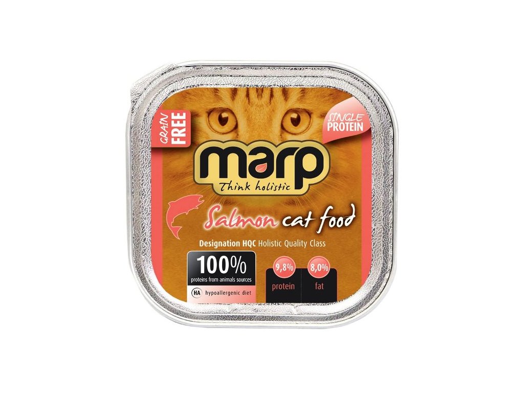 Holistické krmivo Marp pro kočky z masa a vývaru. Marp Holistic se 70% obsahem masem z lososů je delikatesa. Měkká konzistence se dobře přijímá, složení je zcela přírodní a bez obilovin. Vynikající způsob, jak kočku potěšit i pouhým krmivem.