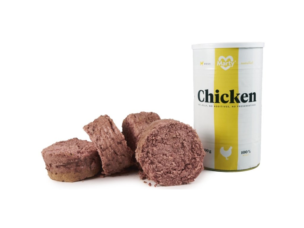 MARTY konzerva pro psy ze 100% masa - kuřecí. Nabízí psovi možnost stravy z čistého a stoprocentního masa bez zatížení konzervanty a dochucovacími či barvícími přísadami. Krmivo neobsahuje sóju, mouku, rýži ani jiné přísady.