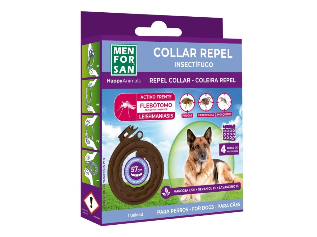 Menforsan antiparazitní obojek obsahuje extrakt z margósy, čímž poskytuje aktivní ochranu proti různým druhům hmyzu, hlavně blechám, klíšťatům, komárům a vším. Je netoxický, a proto ho můžete bezpečně použít u štěňat od prvního měsíce života, březích fen a psů, kteří trpí alergií na běžné insekticidy. Menforsan přírodní obojek pro psy proti klíšťatům a blechám poskytuje aktivní ochranu po dobu tří měsíců. Nespornou výhodou je jeho ergonomie a univerzální velikost, kterou si individuálně nastavíte bezpečnostní přezkou, aby pejsek obojek neztratil. Nebyly zaznamenány žádné nežádoucí účinky či kontraindikace. Obojek je voděodolný.