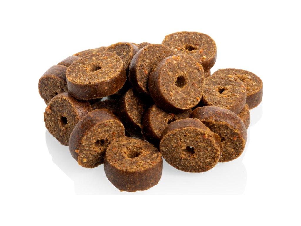 Poloměkké grain-free pamlsky s moučným červem, které neobsahují obiloviny ani drůbeží protein, jsou skvělou volbou pro psy trpící potravinovými alergiemi. Kvalitní zdroje živočišných bílkovin jsou doplněny o zeleninu bohatou na vlákninu a kopřivu, která podporuje metabolismus a je výbornou bylinou při detoxikaci.