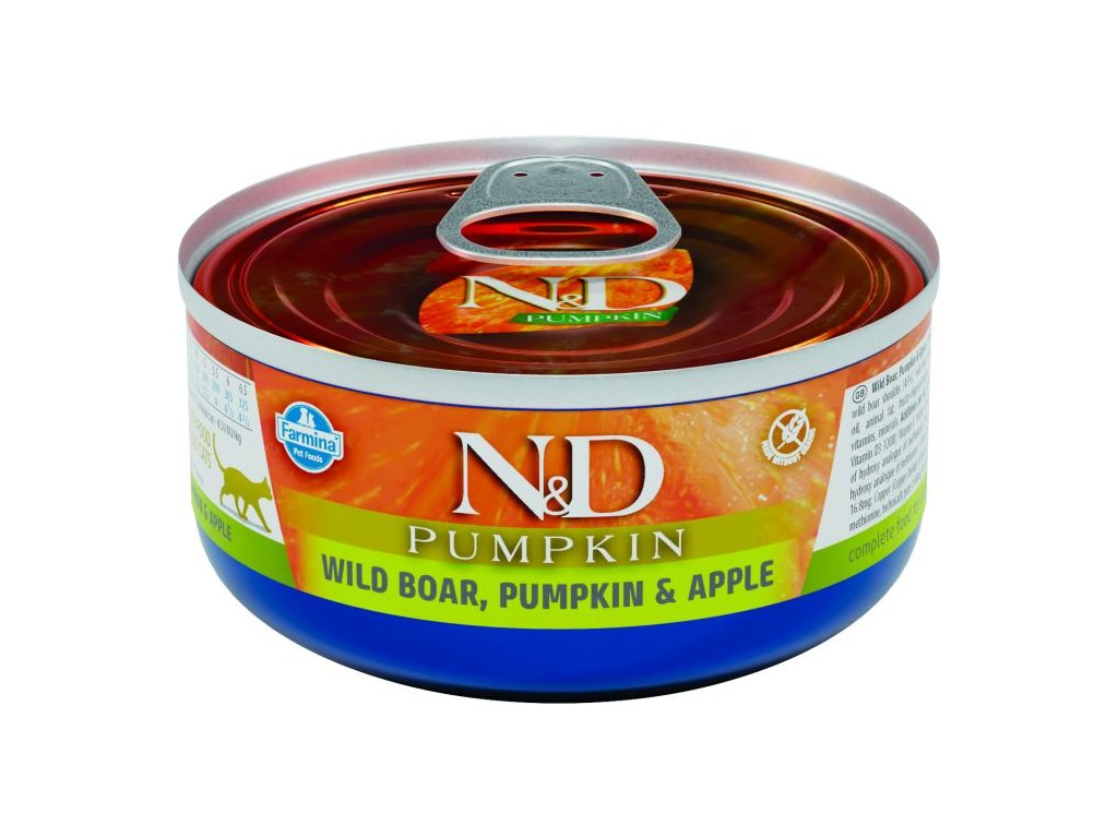 Divočák, dýně a jablko. Kompletní vlhké krmivo pro dospělé kočky. Složení: Plec z divočáka (50%), kolínko z divočáka, dýně (5%), jablko (4%), rybí olej, živočišný tuk, rýže parboiled, fruktooligosacharidy, chondroitin sulfát, glukosamin, vitamíny, minerály. Doplňkové látky na 1 kg – Nutriční doplňkové látky: Vitamín A 4800IU; Vitamín D3 320IU; Vitamín E 160mg; Cholin chlorid 501mg; Zinek (chelát zinku hydroxy analogu methioninu): 36mg; Mangan (chelát manganu hydroxy analogu methioninu): 6.8mg; Železo (chelátová forma Železa(II), hydrát): 16.8mg; Měď (chelát mědi hydroxy analogu methioninu): 2.9mg; DL-Metionin, technicky čistý 1500mg; Taurin 800mg; L-Karnitin 50mg. Analytické složky: Vlhkost 75.00%; hrubý protein 12.50%; hrubý tuk 5.00%; hrubá vláknina 1.00%; hrubý popel 2.50%.