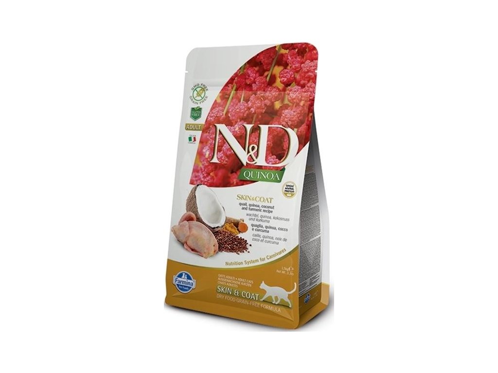 N&D QUINOA SKIN&COATSpeciální receptury pro potravinové alergie, užitečné pro obnovu kůže a srsti.S cennými nutraceutiky jako jsou:Kokos: Bohatý na zinek, jenž je nezbytný pro zdravou kůži; dále obsahuje měď, železo, draslík, hořšík, fosfor a sodík. Vysoký obsah vitamínů B a C uvolňuje napětí a pomáhá při slabosti.Kurkuma: Má významný vliv na obnovu kůže a je bohatá na přírodní antioxidanty.