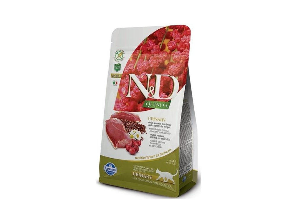 Farmina N&D Quinoa Urinary je krmivo pro zvláštní výživové účely určené k podpoře omezení opakované tvorby struvitových kamenů a onemocnění dolního močového ústrojí koček.