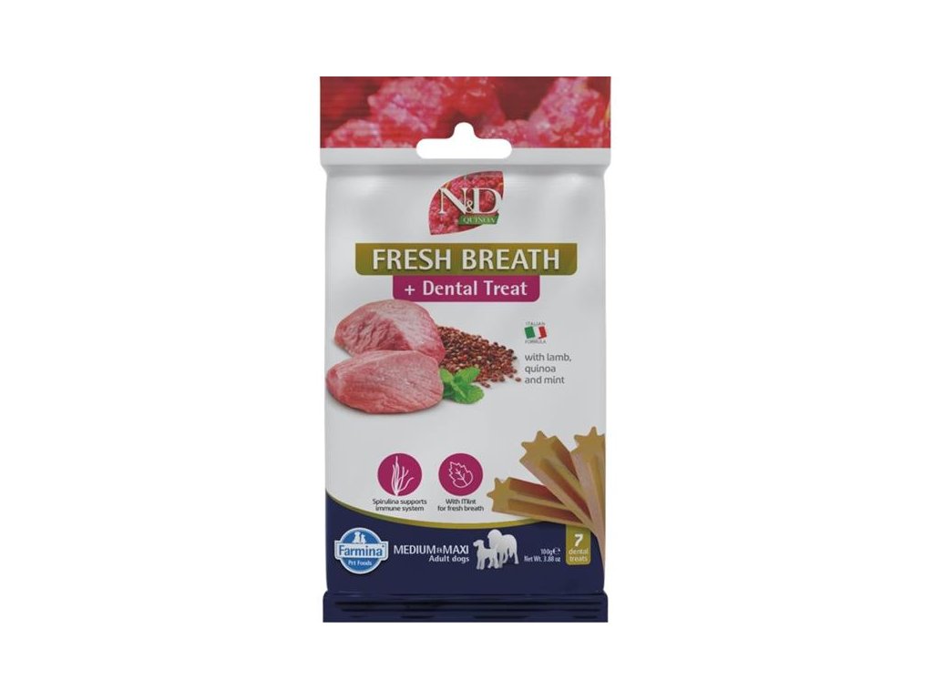 Kolem 80 % dospělých psů čelí problémům v dutině ústní. Parodontální onemocnění je navíc spojeno s vyšším rizikem srdečních a ledvinových problémů. Předcházejte těmto potížím s pomocí dentálních tyčinek N&D Quinoa Fresh Breath Dental Treat pro zdravé zuby a svěží dech psů a štěňat (od 4 měsíců) středních a velkých plemen. Quinoa podporuje trávení, absorpci živin a celkově zdraví trávicího traktu. Máta osvěžuje dech a spirulina pomáhá zlepšovat fungování metabolismu.