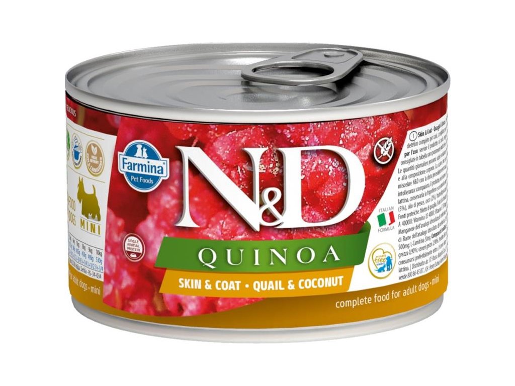 Farmina N&D Quinoa Quail & Coconut je krmivo pro zvláštní účely výživy určené k podpoře omezení intolerance určitých komponentů a živin.