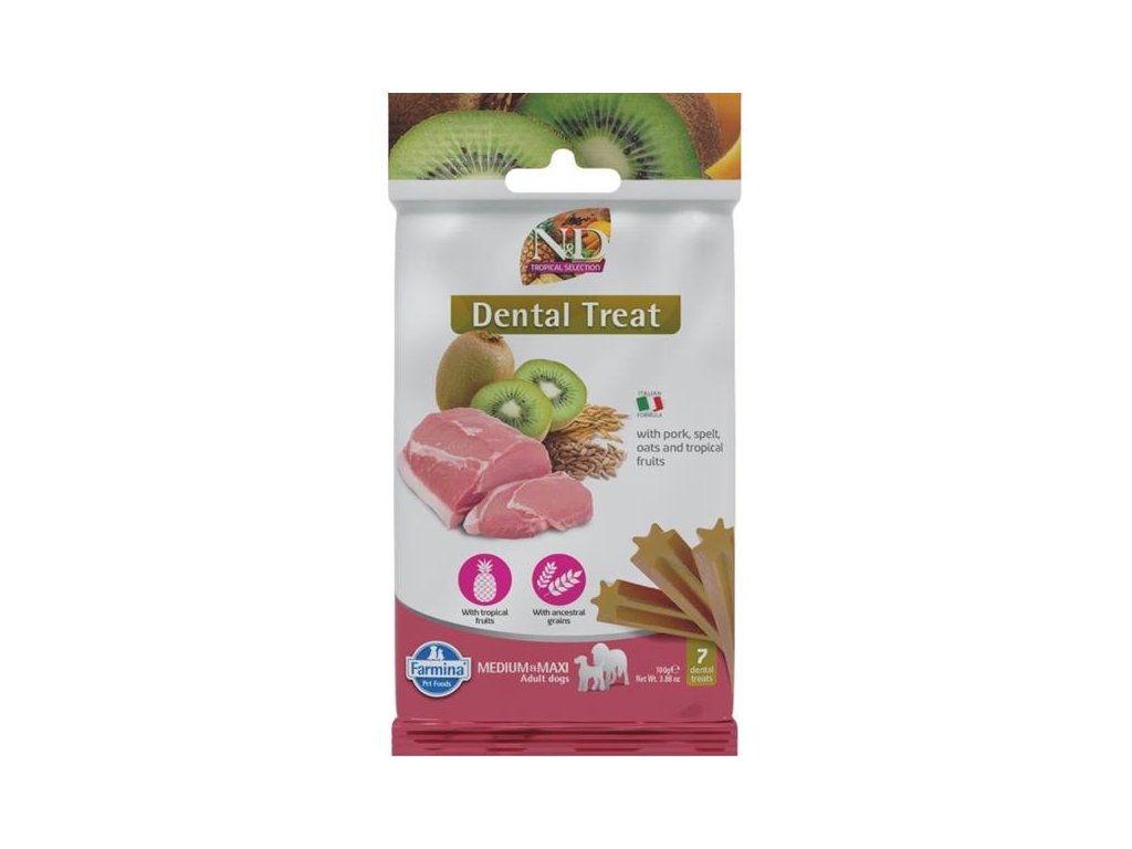 Kolem 80 % dospělých psů čelí problémům v dutině ústní. Parodontální onemocnění je navíc spojeno s vyšším rizikem srdečních a ledvinových problémů. Předcházejte těmto potížím s pomocí dentálních tyčinek N&D Tropical Selection Dental Treat určených pro psy a štěňata (od 4 měsíců) středních a velkých plemen. Oves a špalda s nízkým glykemickým indexem zasytí na delší dobu. Chutnost krmiva zvyšuje přidané tropické ovoce bohaté na přírodní antioxidanty a vitamíny.