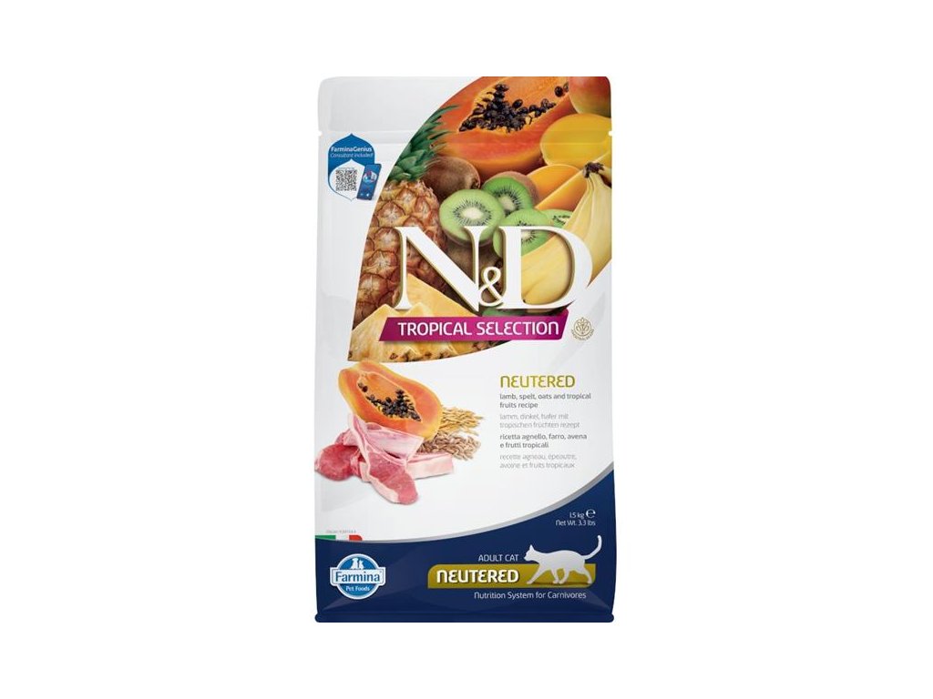 Kompletní nízkoobilné krmivo s jehněčím masem a tropickým ovocem pro dospělé kastrované kočky. Řada N&D Tropical selection v sobě kombinuje kvalitní zdroje živočišných bílkovin, vysoce kvalitní obiloviny a chutné tropické ovoce pro nasycení vašeho zvířecího kamaráda.Granule řady Tropical selection navazují na řadu nízkoobilných krmiv Ancestral Grain, v nichž je maso doplněno ovsem a špaldou. Tyto „staré obilniny“ se vyznačují nízkým glykemickým indexem a tím prodlužují dobu sytosti. Chutnost krmiva zvyšuje přidané tropické ovoce, jako je papája, mango, kiwi, ananas a banán, bohaté na přírodní antioxidanty a vitamíny.