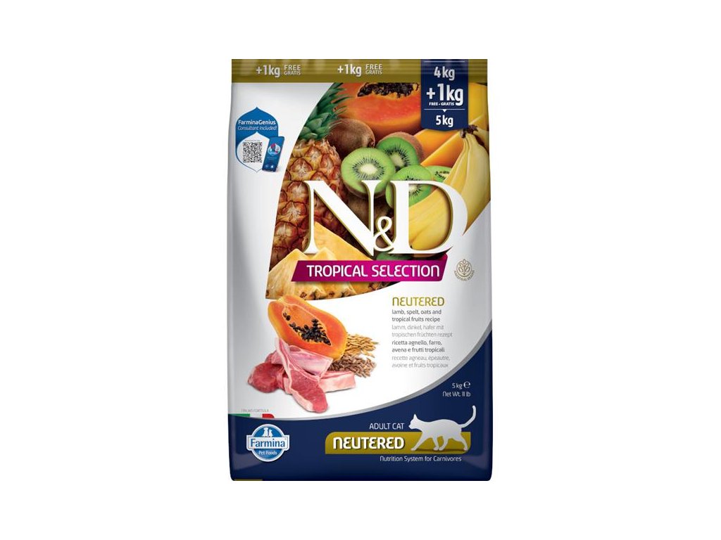Kompletní nízkoobilné krmivo s jehněčím masem a tropickým ovocem pro dospělé kastrované kočky. Řada N&D Tropical selection v sobě kombinuje kvalitní zdroje živočišných bílkovin, vysoce kvalitní obiloviny a chutné tropické ovoce pro nasycení vašeho zvířecího kamaráda.Granule řady Tropical selection navazují na řadu nízkoobilných krmiv Ancestral Grain, v nichž je maso doplněno ovsem a špaldou. Tyto „staré obilniny“ se vyznačují nízkým glykemickým indexem a tím prodlužují dobu sytosti. Chutnost krmiva zvyšuje přidané tropické ovoce, jako je papája, mango, kiwi, ananas a banán, bohaté na přírodní antioxidanty a vitamíny.