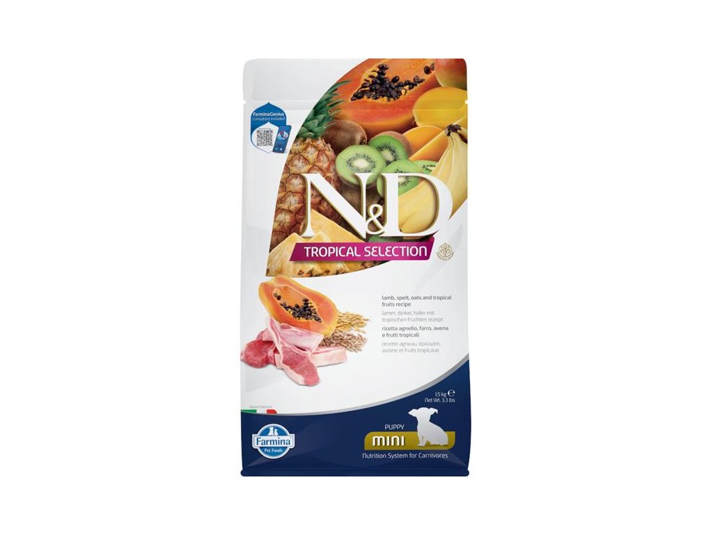 Kompletní nízkoobilné krmivo s jehněčím masem a tropickým ovocem pro štěňata malých plemen. Řada N&D Tropical Selection v sobě kombinuje kvalitní zdroje živočišných bílkovin, vysoce kvalitní obiloviny a chutné tropické ovoce pro nasycení vašeho zvířecího kamaráda.Granule řady Tropical Selection navazují na řadu nízkoobilných krmiv Ancestral Grain, v nichž je maso doplněno ovsem a špaldou. Tyto „staré obilniny“ se vyznačují nízkým glykemickým indexem a tím prodlužují dobu sytosti. Chutnost krmiva zvyšuje přidané tropické ovoce, jako je papája, mango, kiwi, ananas a banán, bohaté na přírodní antioxidanty a vitamíny.Krmivo je vhodné i pro březí a kojící feny.