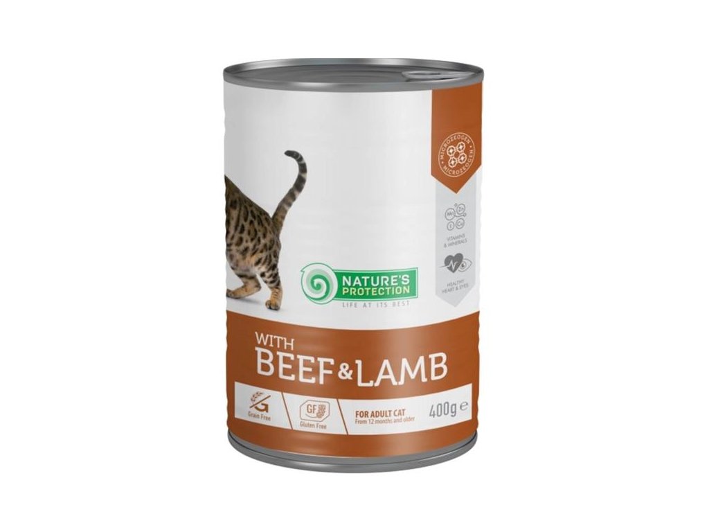 Doplňkové vlhké krmivo ve formě konzervy je určené pro mladé a dospělé kočky. Hlavním zdrojem bílkovin s vysokou nutriční hodnotou je kvalitní hovězí a jehněčí maso. Přidaná aminokyselina taurin podporuje zdraví očí a srdce. Konzerva je ideálním doplňkem k suchému krmivu Nature´s Protection.