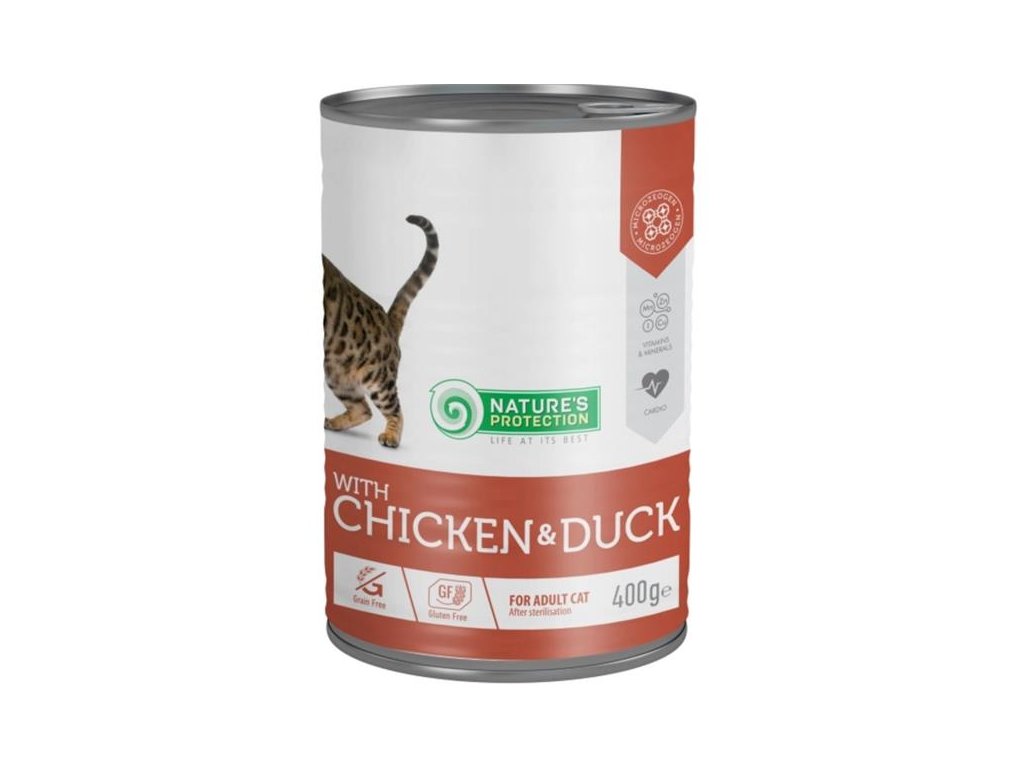 Doplňkové vlhké krmivo ve formě konzervy je určené pro kastrované kočky od 12 měsíců věku. Hlavním zdrojem bílkovin s vysokou nutriční hodnotou je kvalitní kuřecí a kachní maso. Přidaná aminokyselina taurin podporuje zdraví očí a srdce. L-karnitin pomáhá kočce udržet optimální hmotnost. Konzerva je ideálním doplňkem k suchému krmivu Nature´s Protection.