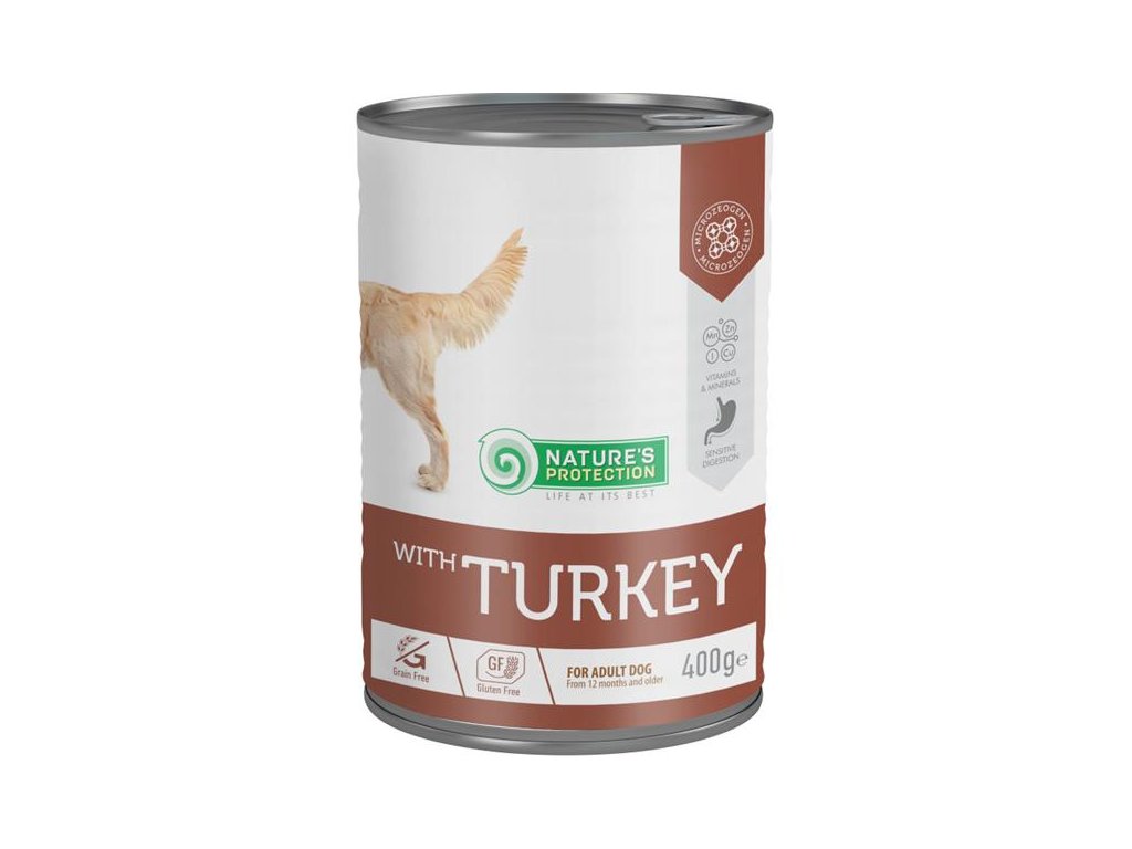 Doplňkové vlhké krmivo je určené pro dospělé psy s citlivým zažíváním. Hlavním zdrojem bílkovin s vysokou nutriční hodnotou je kvalitní krůtí maso. Přírodní doplněk MicroZeoGen pomáhá odstraňovat toxiny z těla a posiluje imunitní systém. Konzerva je ideálním doplňkem k suchému krmivu Nature´s Protection.