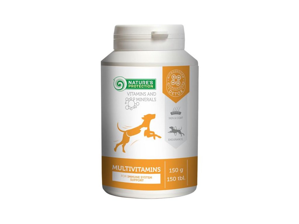 Nature’s Protection Multivitamin je speciálně vyvinutý výživový doplněk pro dospělé psy složený z přírodních látek včetně Microzeogenu – dynamicky mikronizovaného klinoptilolitu (nerostu sopečného původu), který napomáhá detoxikaci organismu. Tento doplněk stravy je navržen tak, aby poskytoval základní živiny, které mohou v běžné stravě psa chybět. Obsahuje komplex 10 vitamínů a také biotin, který zlepšuje stav kůže a sliznic, reguluje vstřebávání vápníku a fosforu, podporuje hormonální rovnováhu, krevní oběh a tvorbu pojivových tkání a chrupavek. Může také podpořit vedení nervových impulzů, metabolismus a celkové zdraví a vitalitu psa.