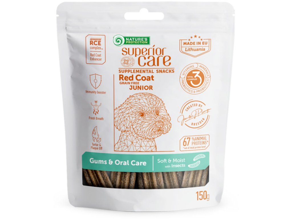 Nature’s Protection Superior Care Red Coat Junior Gums & Oral Care je prémiový doplněk stravy s hmyzem vyvinutý speciálně pro mladé psy všech plemen s červenou (rezavou) srstí pro udržení dobrého zdraví ústní dutiny a zubů. Žvýkací tyčinky díky speciálnímu tvaru účinně čistí plak ze zubů psa. Jsou grain-free – neobsahují obiloviny, které by mohly způsobit alergické reakce. Mají vyvážené množství probiotik a prebiotik, díky čemuž přispívají k harmonizaci střevního prostředí, podporují zdravé střevní bakterie a napomáhají hladkému trávení. Speciální složení pomáhá chránit a zvýrazňovat červený pigment srsti.
