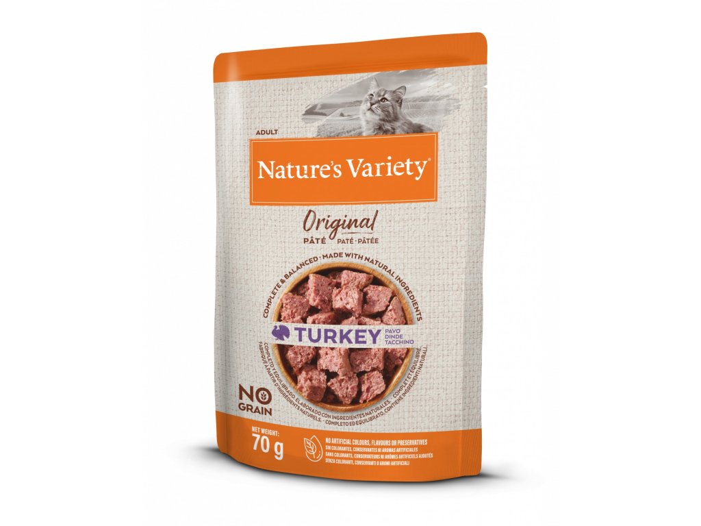 Kapsička Nature´s Variety Original pro kočky s krůtou je lahodná paštika se spoustou masa (70 % krůtího) a lahodnou chutí. Nature's Variety přesvědčí díky své chutné receptuře i náročné kočičí labužníky a je ideální pro každodenní výživu. Mokré krmivo neobsahuje obiloviny, a je proto vhodné pro citlivé kočky s příslušnými alergiemi a intolerancemi. Nature's Variety Original se vyrábí v Německu podle přísných nároků na kvalitu. Příprava je obzvláště šetrná, aby se optimálně zachovaly živiny obsažené v surovinách.
