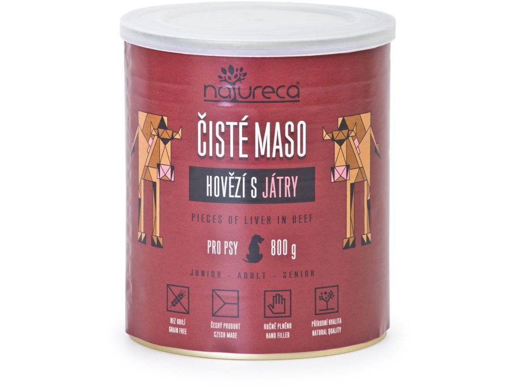 Hovězí s játry je konzerva obsahující 30 % kusů játer ručně vložených do 70 % na hrubo namletýho hovězího masa.Kvalitní 100% masová konzerva je vhodná pro všechny věkové kategorie a plemena psů.Všechny naše konzervy pro psy a kočky jsou přírodní a bez jakýchkoliv barviv, aromat, konzervantů, chemikálií, obilovin nebo sóji.Výroba našich konzerv je pod stálým státním veterinárním dozorem. Uchovejte v chladu a suchu. Datum spotřeby je uvedeno na obalu.Maso je neoddelitelnou součástí každodenního jídelníčku psa. Dodává mu potřebnou energii, ale je také bohaté na minerálne látky. V neposlední řade psům moc chutná.Hovězina - obsahuje kromě železa i hodně zinku, selenu, kyseliny listové a vitaminu B12. Je také přirozeným zdrojem CLA (konjugovaná kyselina linolová, která napomáhá k vytvoření optimální rovnováhy mezi svalovou a tukovou hmotou v tele psa.Krajina původu: Česká republika Krmný návod: podává se při pokojové teplotě. Po otevření uchovejte v chladu. Složení: 70% hovězí maso + vedlejší produkty - hovězí droby, 30% játra Analýza: hrubý protein 16 %, hrubý tuk 11 %, hrubá vláknina 0,5 %, hrubý popel 2,5 %,vlhkost 70 %, vysoký přirozený obsah vitamínů (A, E, D), aminokyselin (lysin, methionín, cystín) a minerálů Doporučená krmní dávka: hmotnost psa – denní dávka5kg – 200g | 10kg – 400g | 20kg – 600g | 30kg – 800g