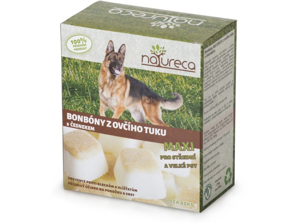 Při užívání ovčího tuku Natureca se na vašem psovi prokáže zdravější pokožka, lesklá srst, silnější kosti, lepší zdraví, vyšší odolnost a lepší střevní mikroflóra. Bonbony z ovčího tuku Natureca mohou pomoci i proti nepříjemnému vypadávání srsti psa, proti suché či šupinaté nebo podrážděné pokožce a celkově posiluje obranyschopnosti organismu. Jsou také vhodné pro psy trpící alergiemi na potraviny a také pro psy s dietou na jehněčím mase. Přídavek česneku je perfektní pro zdravé střevní prostředí.