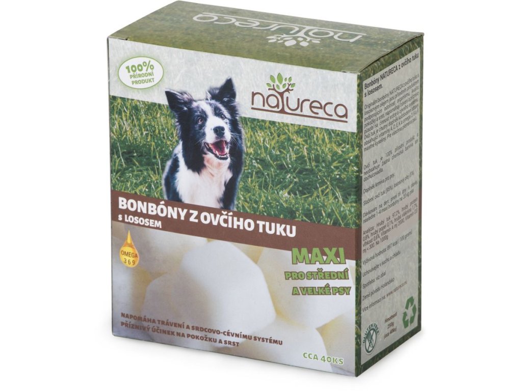 Při užívání ovčího tuku Natureca se na vašem psovi prokáže zdravější pokožka, lesklá srst, silnější kosti, lepší zdraví, vyšší odolnost a lepší střevní mikroflóra. Bonbony z ovčího tuku Natureca mohou pomoci i proti nepříjemnému vypadávání srsti psa, proti suché či šupinaté nebo podrážděné pokožce a celkově posiluje obranyschopnosti organismu. Jsou také vhodné pro psy trpící alergiemi na potraviny a také pro psy s dietou na jehněčím mase. Přídavek lososového oleje zvyšuje odolnost organismu a pečuje o zdravou kůži a srst.