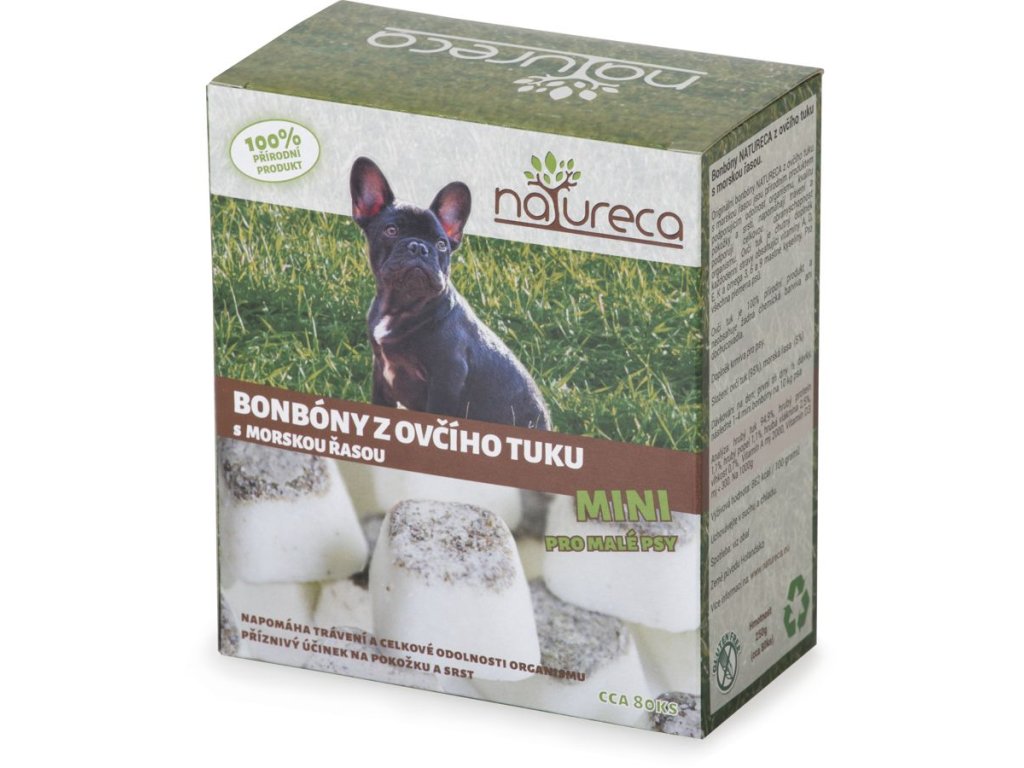 Originální a zcela netradiční přírodní pamlsek - bonbón z chutného ovčího tuku. Natureca je přírodním produktem podporujícím odolnost organismu, zlepšují kvalitu pokožky a srsti a napomáhají trávení. Ovčí tuk je chutný doplněk krmiva, je bez zápachu a je důležitý k přísunu vitamínů A, D, E a K. jsou nezbytné pro zrak, posílení kostí a pohybového aparátu, příznivě působí na dýchací cesty a mají blahodárný vliv na gastrointestinální trakt. Kromě toho vitamíny A a D podporují imunitní systém, jinými slovy chrání organismus proti bakteriím a infekcím. Svému pejskovi můžete dávat bonbony z ovčího tuku jako odměnu a zároveň upevňujete jeho zdraví.