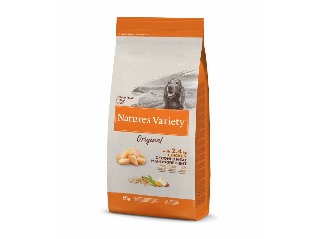 Krmivo Nature's Variety Original Medium Adult kuřecí je kompletní krmivo v podobě granulí prodospělé psy středních a velkých plemen nad 10 kg, které obsahuje velké množství vykostěnéhokuřecího masa (20 %)a je obohaceno o vybrané rostlinné složky. Mezi ty patří batáty, hrách a cizrna, které krmivu dodávají sacharidy. Krmivo pro každodenní výživu, kompletní a vyvážené složení s koordinovaným obsahem energie a živin. Krmivo neobsahuje obiloviny, a proto je vhodné pro psy s odpovídajícími alergiemi a intolerancemi. K doplnění vyvážené a kompletní receptury jsou v krmivu zpracovány rostlinné suroviny, které mu dodávají vitální látky, minerální látky a vitaminy. Krmivo obsahuje složky, které podporují zdraví kůže a srsti, recepturu s ovocem, zeleninou a dalšími rostlinnými složkami, vlákninu, vitaminy a minerální látky. Zdroj antioxidantů může podpořit normální imunitní systém. Krmivo jebez umělých barviv, aromat a konzervantů