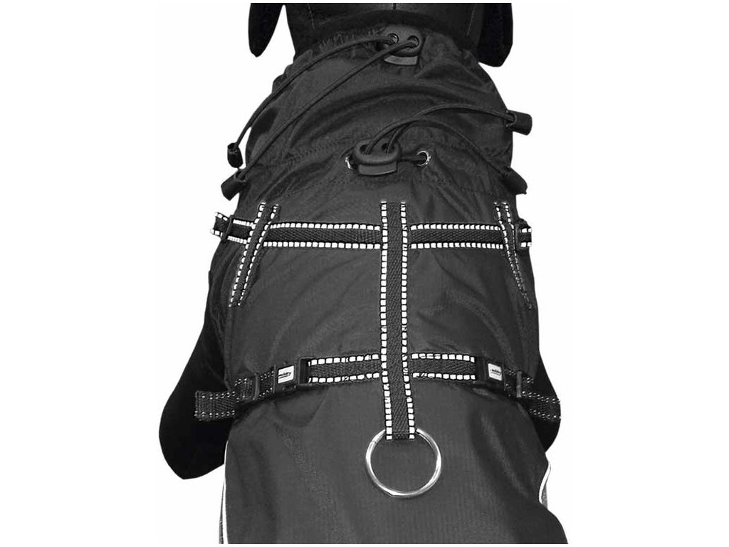 S integrovaným nylonovým postrojem s plynule nastavitelnou délkou. Funkčním materiálem jsou prodyšné, ale nepromokavé syntetycké vlákna, které dokáží udržet psa v suchu a teple i po dlouhé hodiny tréninku.
