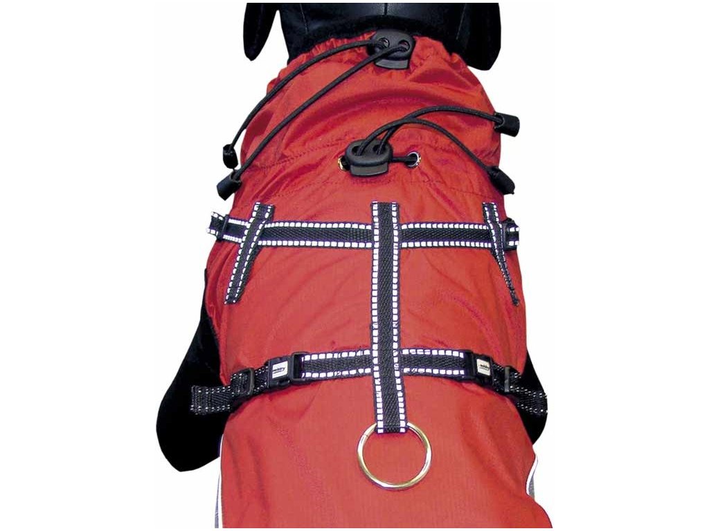 S integrovaným nylonovým postrojem s plynule nastavitelnou délkou. Funkčním materiálem jsou prodyšné, ale nepromokavé syntetycké vlákna, které dokáží udržet psa v suchu a teple i po dlouhé hodiny tréninku.