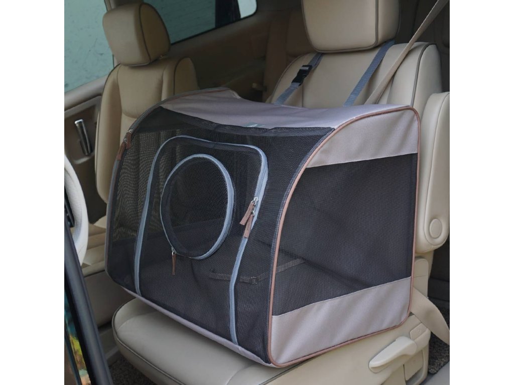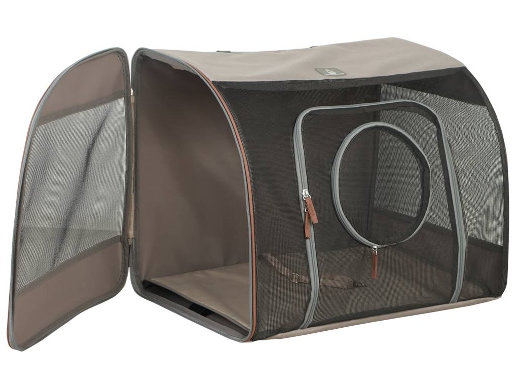 Malé síťové přední okno lze otevřít tak, aby zvíře vytáhlo hlavu ven. Cestovní taška má odnímatelné dno pro snadnou údržbu.