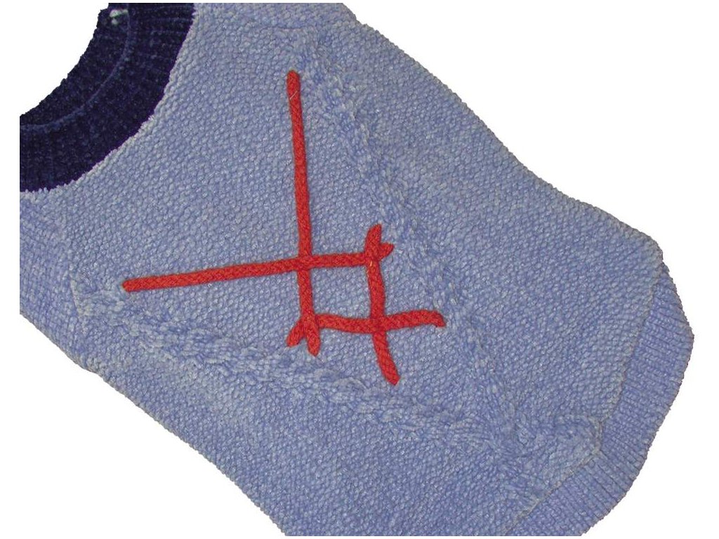 Pletený svetr pro psy značky Nobby. Barva modrá s červeným designovým provázkem na zádech. Materiál: mikrovlákno (polyester). Nohavičky na předních nohách.